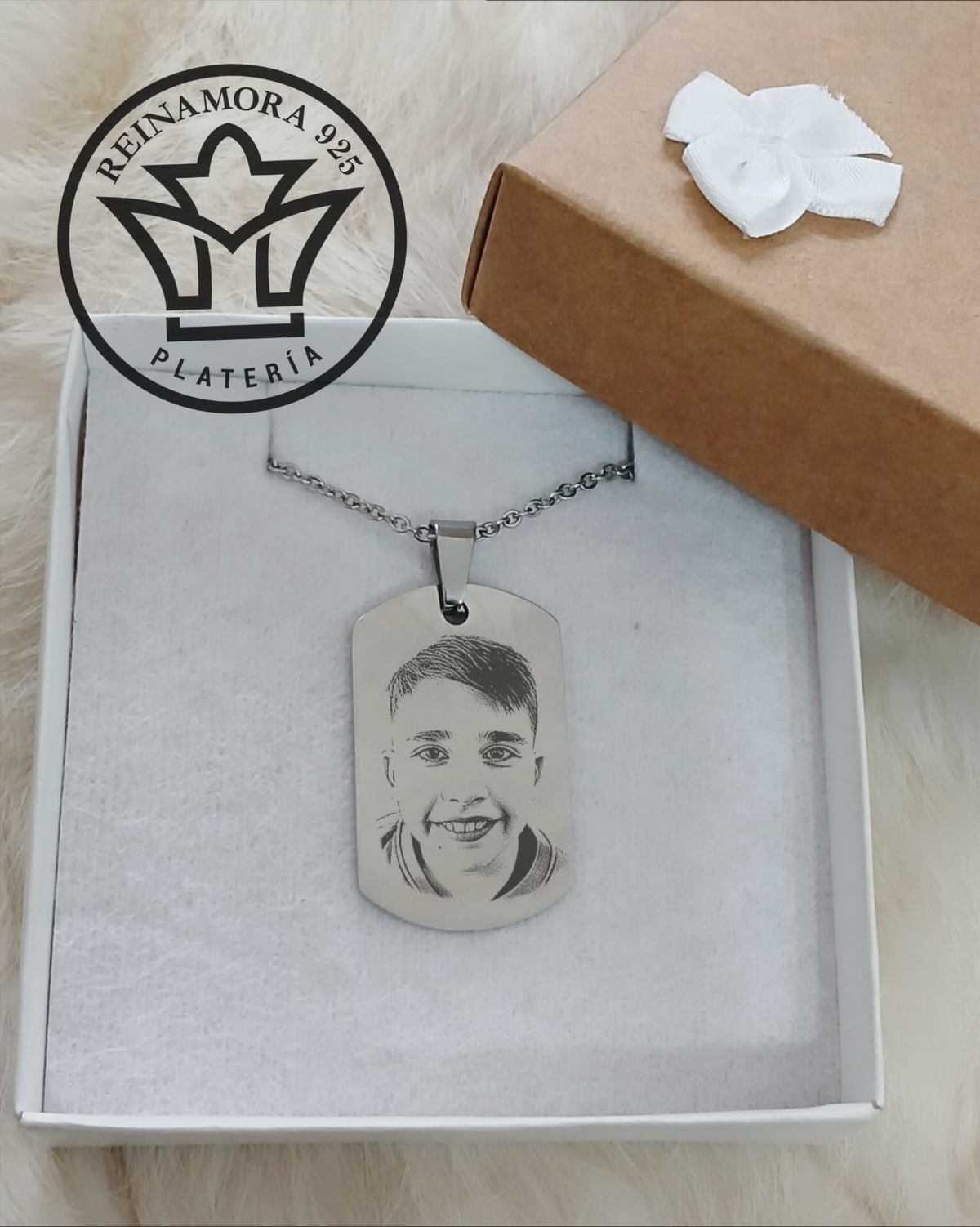 Medalla con fotografía frente y atras, cadenita de 45cms, (o accesorio de acero para llavero), boceto final impreso de recuerdo, estuche y bolsita todo listo para regalar. (Lámina postal de agradecimiento coleccionable 1619, incluida sin costo)