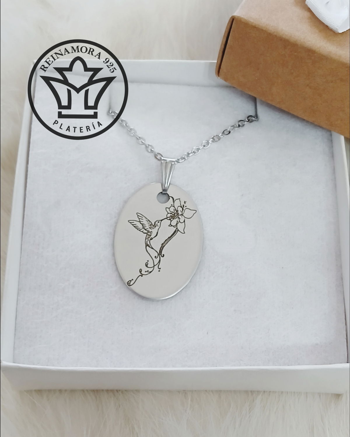 El dije mide 30x20mm. La cadena forcet 2mm 45cm. El grabado es en ambos lados. Puede grabar datos personales, logos y frases.