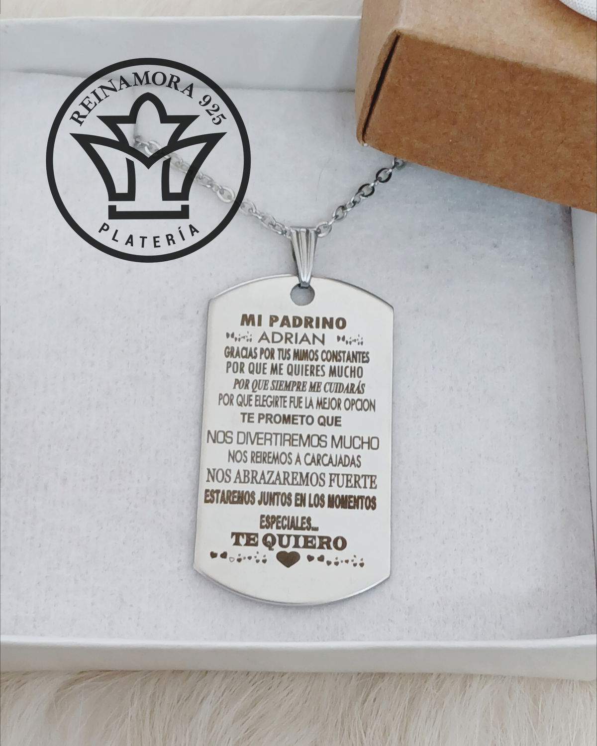 Dije Acero Quirúrgico Rectangular 43x24mm + Cadena + Grabado frase