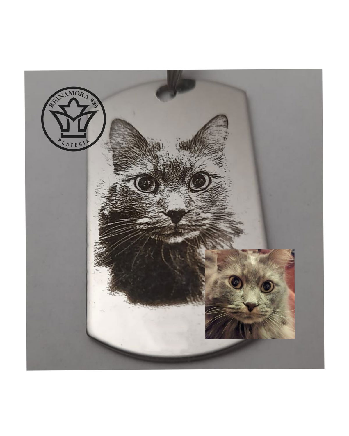 Medalla con fotografía frente y frase atrás sin costo (o fecha de calendario), cadenita de 45cms, (o accesorio de acero para llavero), boceto final impreso de recuerdo, estuche y bolsita todo listo para regalar.