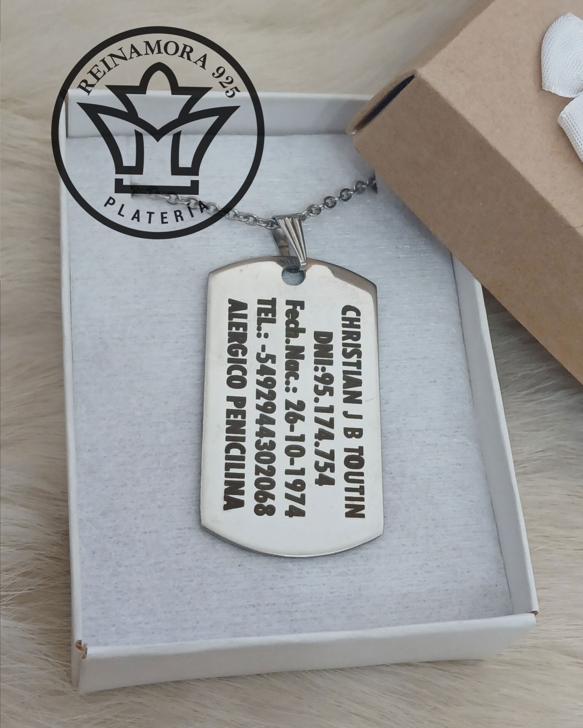 Dije Acero Quirúrgico Rectangular 43x24mm + Cadena + Grabado Texto Alergia