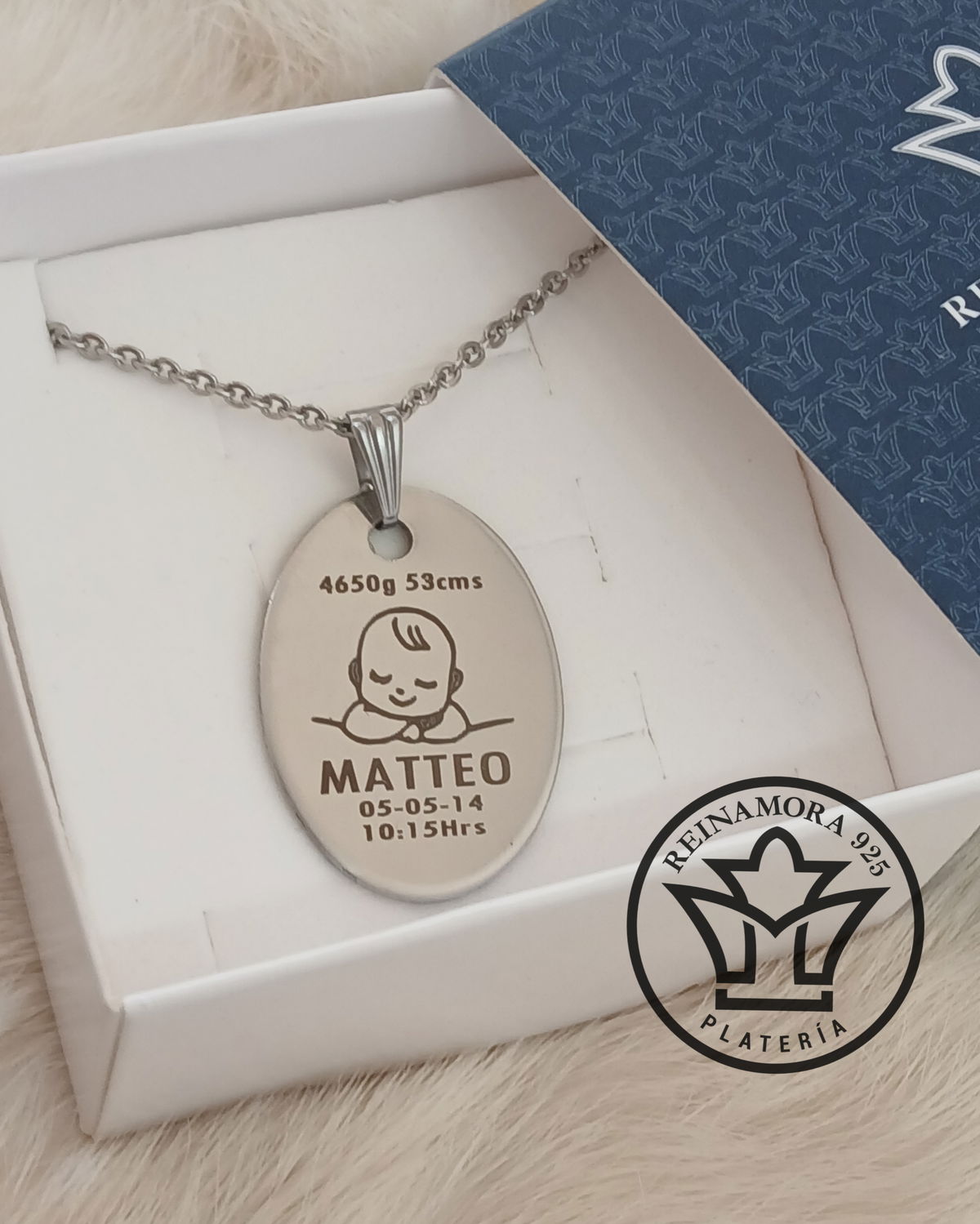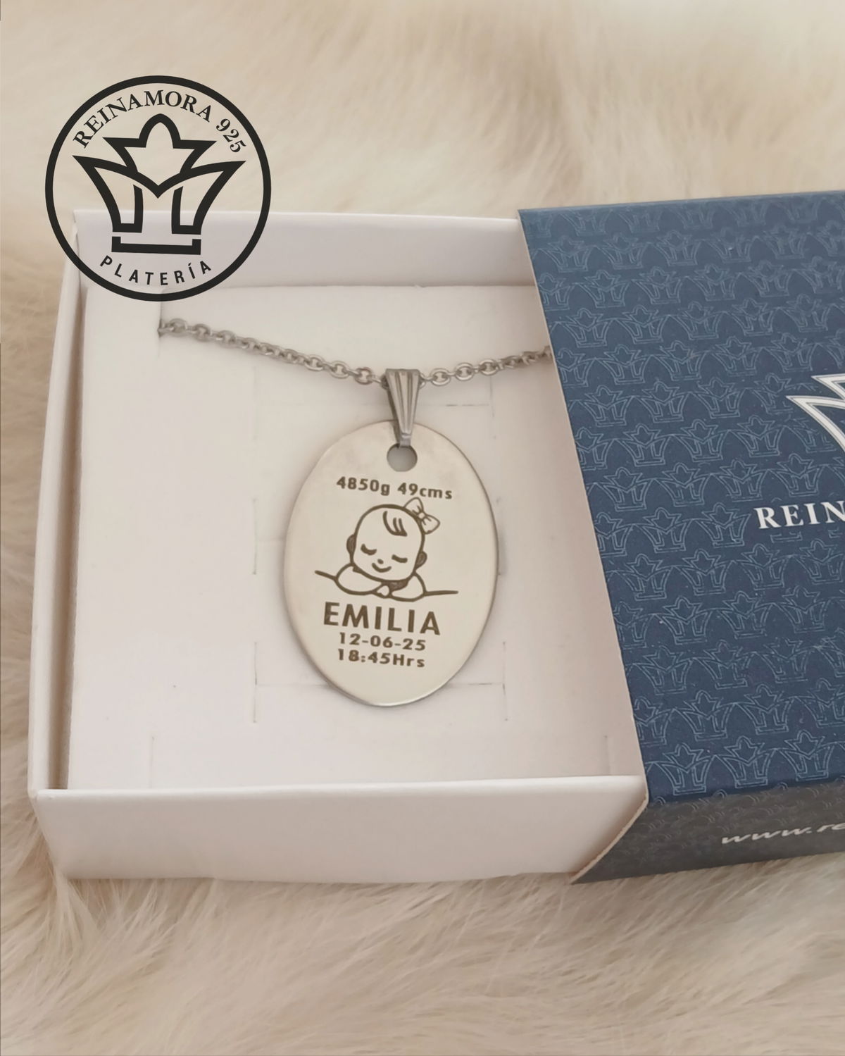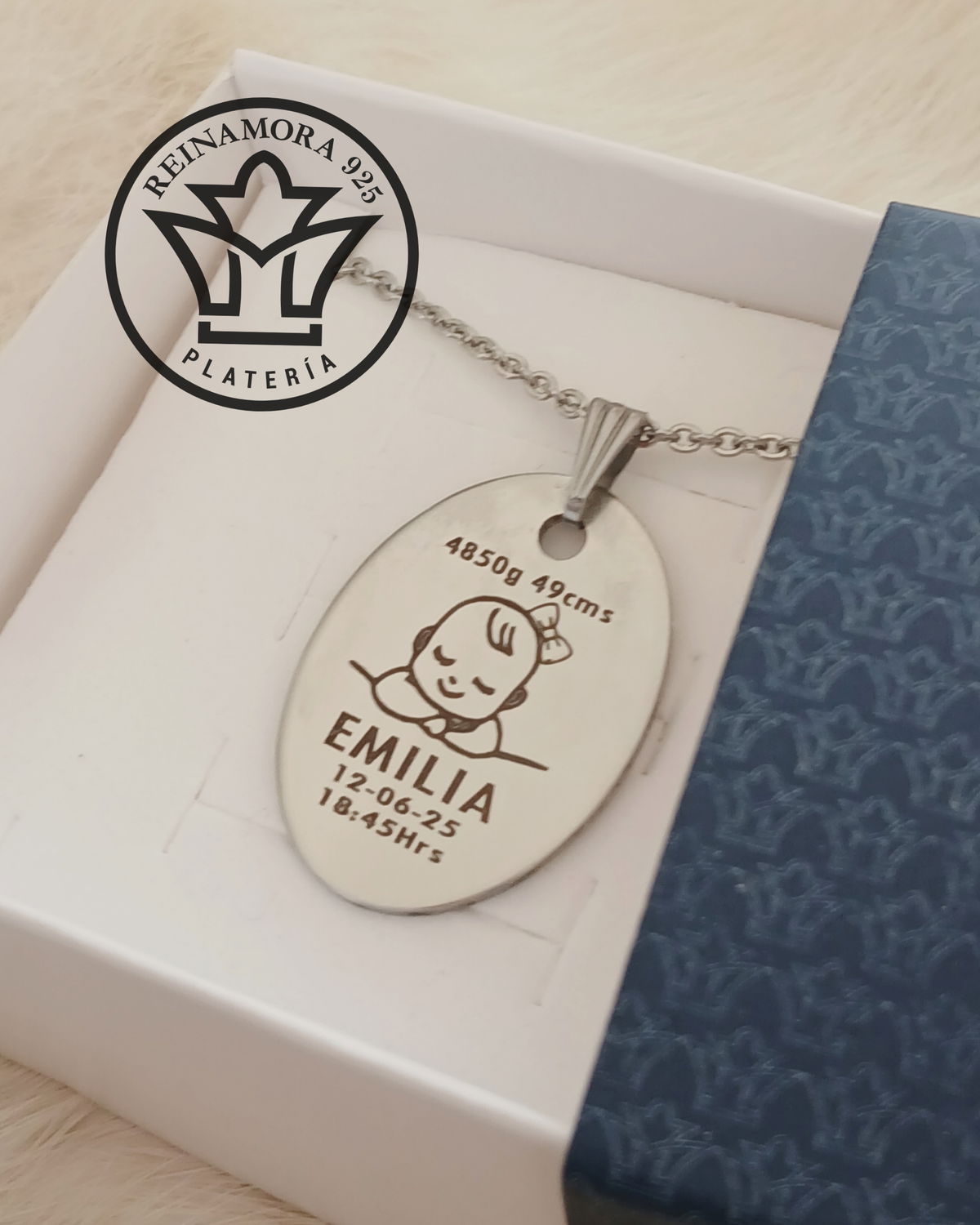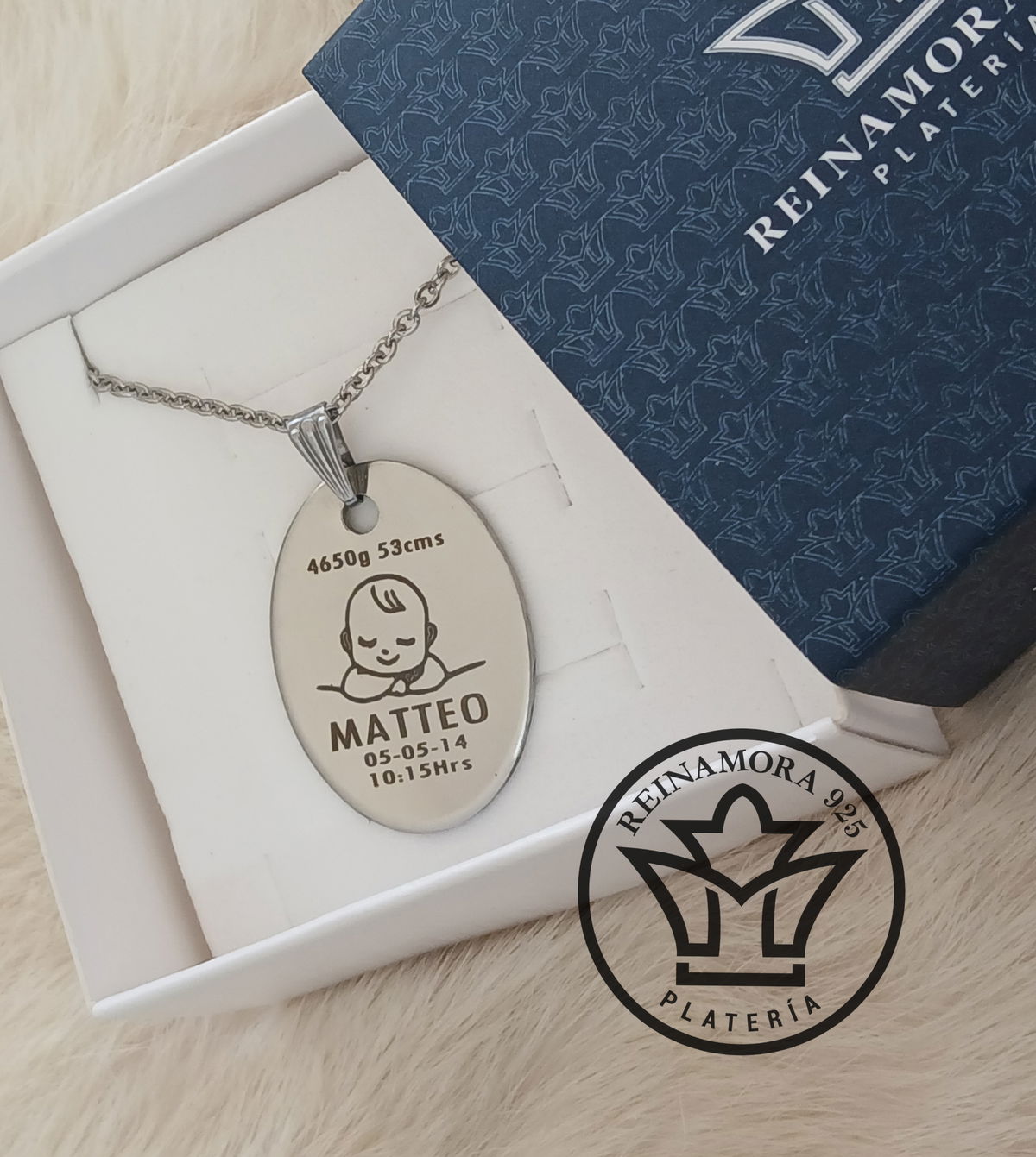 El dije mide 30x20mm. La cadena forcet 2mm 45cm. El grabado es en ambos lados. Puede grabar datos personales, logos y frases.