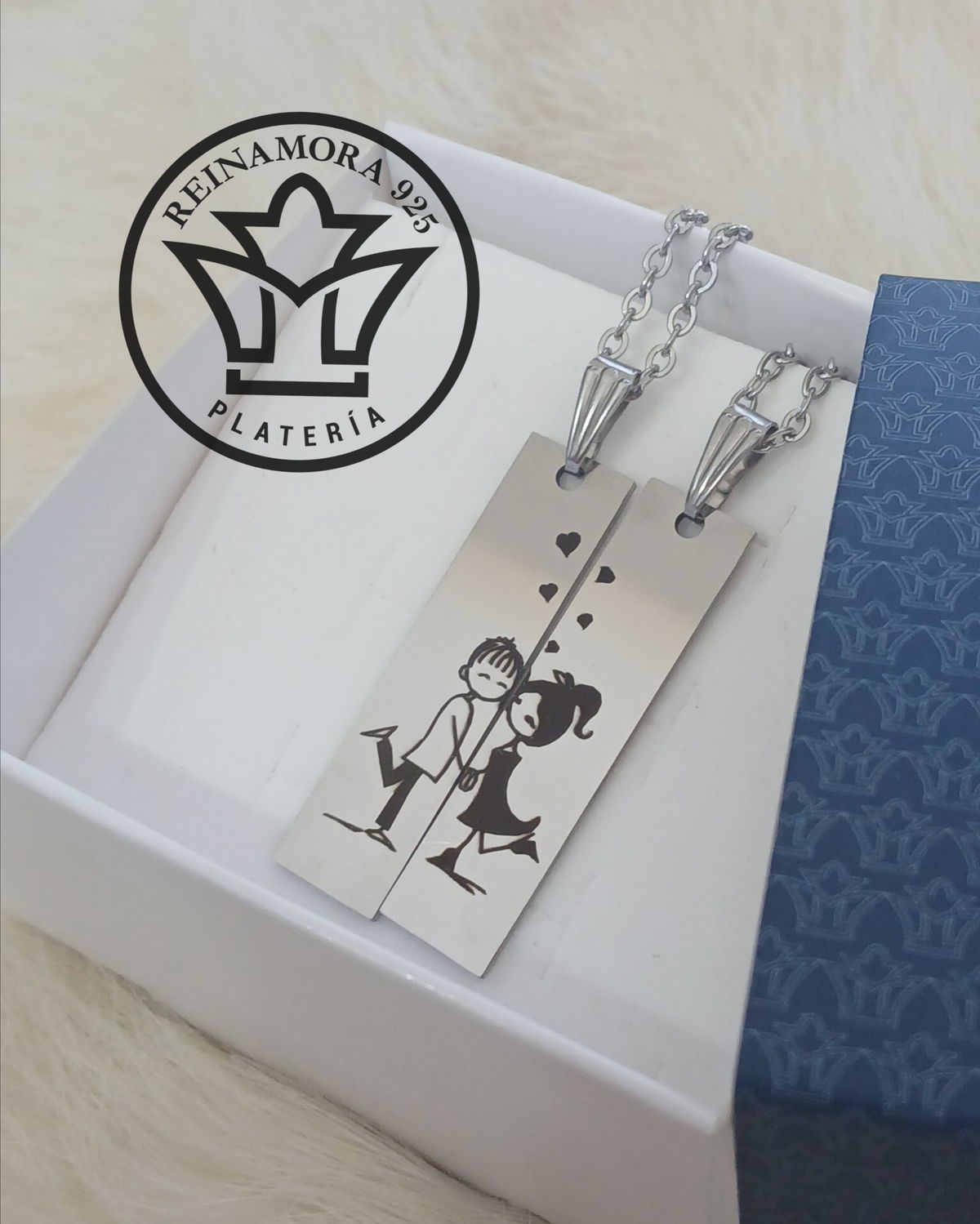 El precio incluye 2 cadenas de acero force de 45cm, el grabado adelante imagen (puedes agregar iniciales) y atras de nombres o iniciales. Viene con packaging listo para regalar.